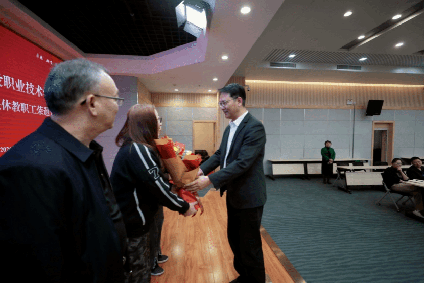人文教育學院原院長、黨總支書記楊颯颯作為退休職工代表發言。她深情回顧了自大學畢業便扎根學校、與學校同呼吸共成長的33載歲月,字里行間飽含對教育事業的熱愛和對學校的深厚情感。她親歷了學校從中專到高職的跨越式發展,見證了學校躋身國家“雙高計劃”建設行列的奮斗歷程,并參與了學校沖刺職業本科的關鍵征程。她表示,雖已退休,但仍將關注學校發展,繼續貢獻力量、發揮余熱。