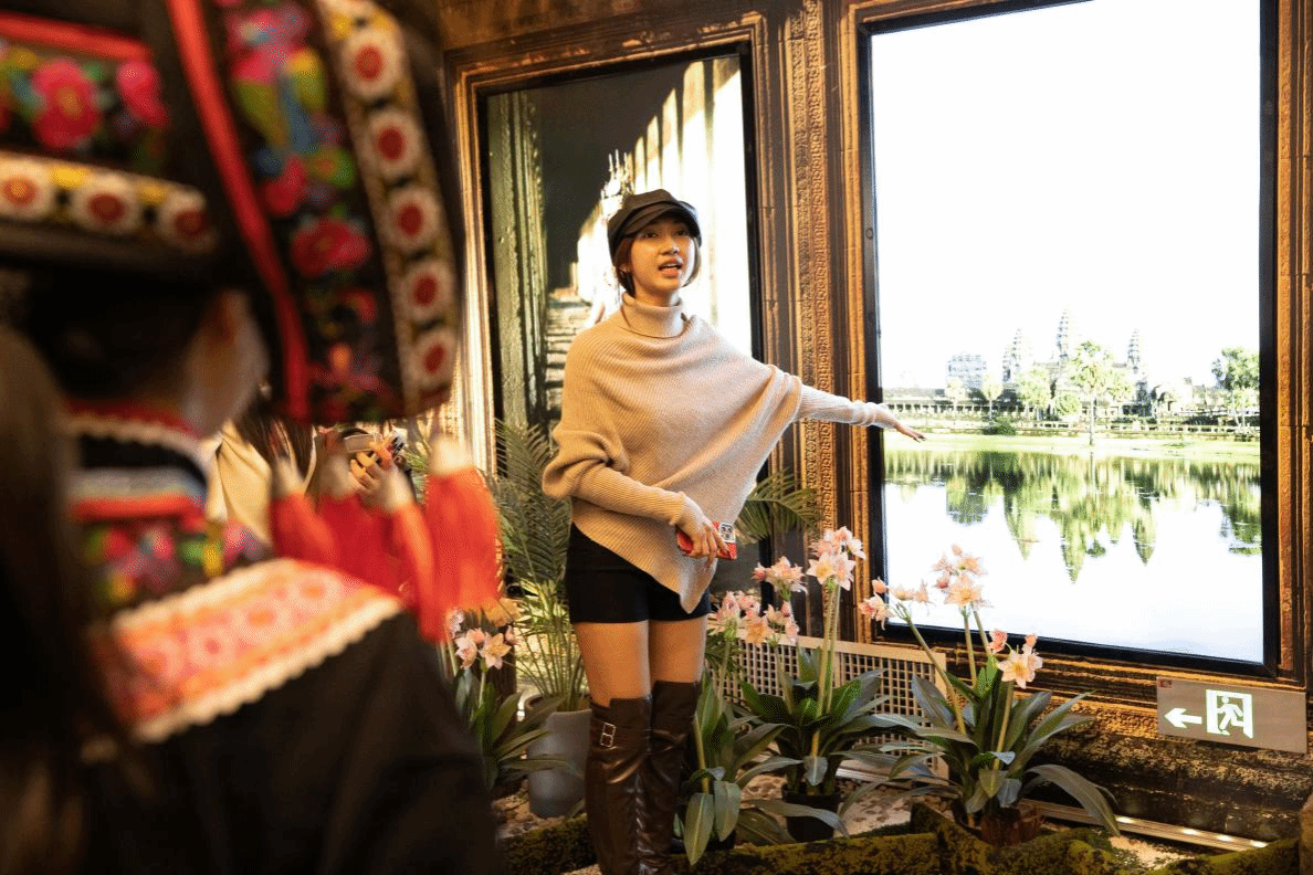 在柬埔寨館的“歲月園林”中,來自柬埔寨的棉金芳同學滿懷熱情地向大家展示了她的家鄉特色——吳哥窟,并熱情邀請大家前往她的家鄉游覽。