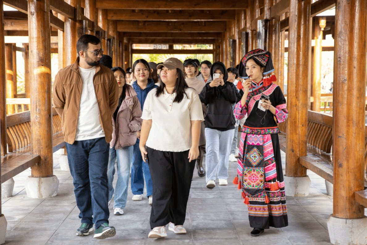留學生們在廊中駐足,聆聽著中國學生對風雨橋歷史和文化的介紹,他們對這種將自然景觀與人文藝術完美結合的建筑形式表示了極大的興趣。