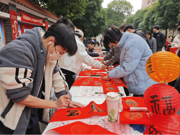 活動現場熱鬧非凡,300余名同學積極參與其中。有的同學拿起毛筆,揮毫潑墨,書寫著對新年的美好祝愿。對于不會寫毛筆字的同學,工作室專門邀請了經驗豐富的老師和書畫攝影協會的同學現場幫忙書寫。一筆一畫間,不僅傳遞著新年的祝福,更展現了中華書法的獨特魅力。