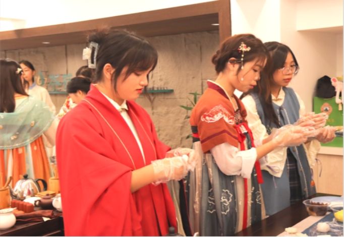 茶藝基地充分發(fā)揮重要時(shí)間節(jié)點(diǎn)的心理育人功能,在傳統(tǒng)節(jié)日開展“我們的節(jié)日”特色活動,增強(qiáng)學(xué)生的認(rèn)同感和自豪感,鑄牢中華民族共同體意識。在廣西“三月三”,通過趕歌圩、傳繡球、打扁擔(dān)、嘗五色糯米、制艾葉糍粑場景體驗(yàn),加深了同學(xué)們對壯族文化的了解和認(rèn)同,同時(shí)增進(jìn)了解和信任,建立緊密和諧的人際關(guān)系;在中秋節(jié),師生們圍桌而坐,賞明月、品月餅,弘揚(yáng)和諧、團(tuán)圓、互敬的價(jià)值觀念,增強(qiáng)情感聯(lián)結(jié)與歸屬感、滿足心理需求,緩解壓力;在每一個(gè)節(jié)氣,開展“夢想朗讀者”專題誦讀,推出“《夢想朗讀者》之二十四節(jié)氣”系列48期,用真摯動人的朗誦,提醒師生順應(yīng)天時(shí)、敬畏自然、提升生活品質(zhì)與審美情趣。