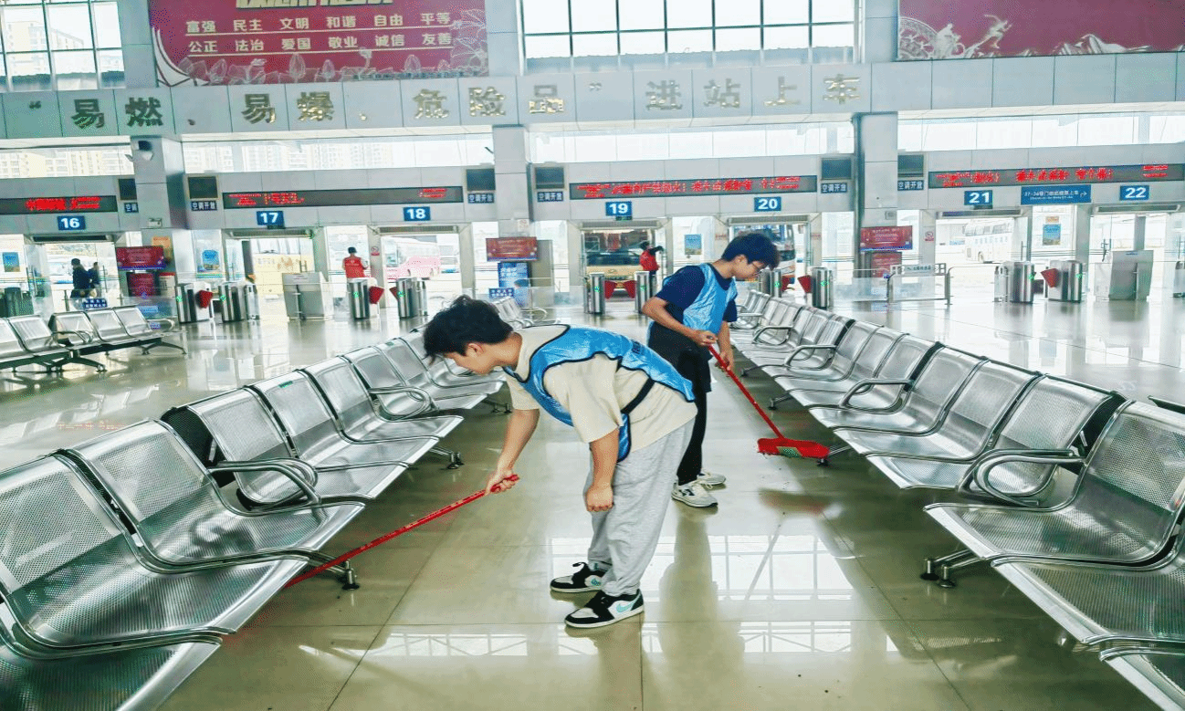 完成周邊清掃工作后,同學(xué)們進入客運站內(nèi)部,對站內(nèi)的衛(wèi)生進行打掃。他們仔細擦拭座椅、窗戶、欄桿等設(shè)施,讓客運站內(nèi)部面貌煥然一新。“擦拭的過程需要細心和耐心,但當(dāng)我看到被擦拭得一塵不染的設(shè)施時,內(nèi)心充滿了成就感。”網(wǎng)絡(luò)2304班的黃承圳同學(xué)分享了參加本次活動的收獲。