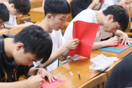在實踐互動環節,有的同學熱烈討論該如何入手,有的同學凝心聚氣地思考,有的同學躍躍欲試......在老師的指導與同學們的相互提點下,隨著剪刀、刻刀的起起落落,一張張紅紙在同學們手中逐漸煥發出別樣的風采,變成了靈動的剪紙作品。