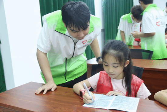 志愿者指導小朋友填寫《研學手冊》