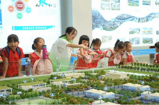 志愿者向小朋友講解沙盤模型
