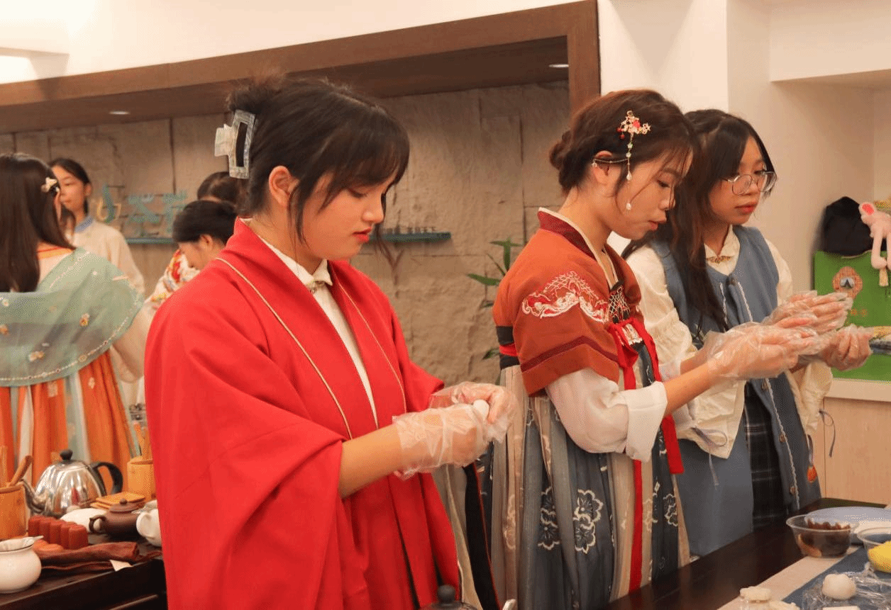 活動中,韋珍安老師向同學們介紹了中秋節的起源、發展歷程、傳統習俗,還介紹了月餅和茶的搭配習慣。甜口的月餅,比如蓮蓉月餅、豆沙月餅、冰皮月餅,通常搭配綠茶。綠茶淡雅輕靈,能有效促進葡萄糖的代謝,可防止過多的糖分留在體內。咸口的月餅通常和烏龍茶搭配。烏龍茶為半發酵茶,兼有綠茶的清香氣味和紅茶的甘甜口感,和清爽淡雅的咸甜味月餅搭配起來更能襯出月餅的思古幽情。葷油的五仁叉燒月餅、火腿月餅適合普洱茶。普洱茶滋味清淡,醇厚穩健,可以平衡月餅口感上的油膩。