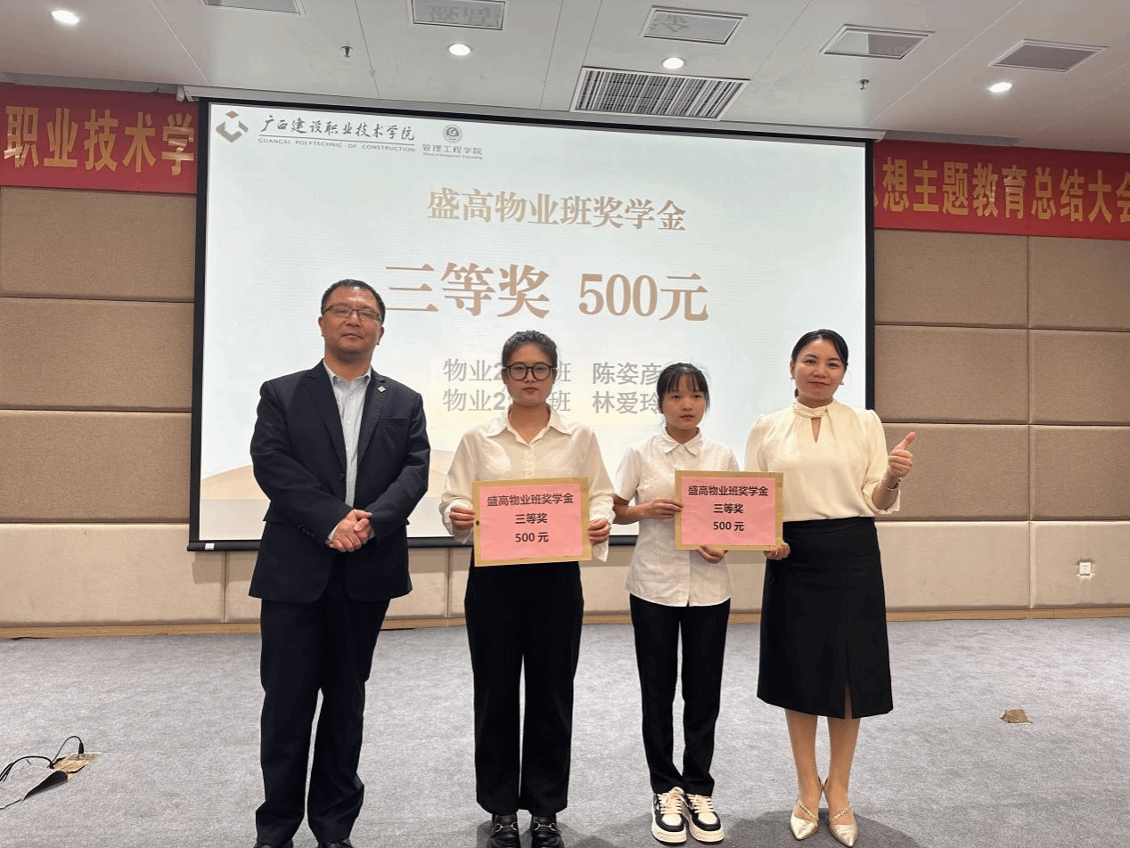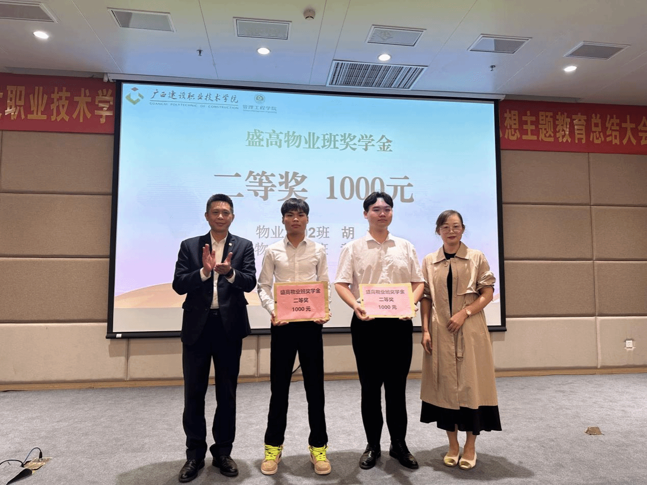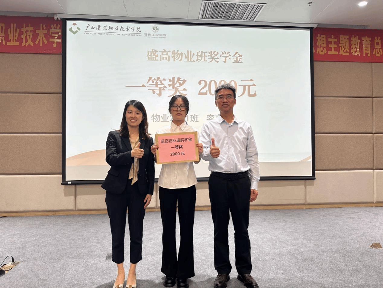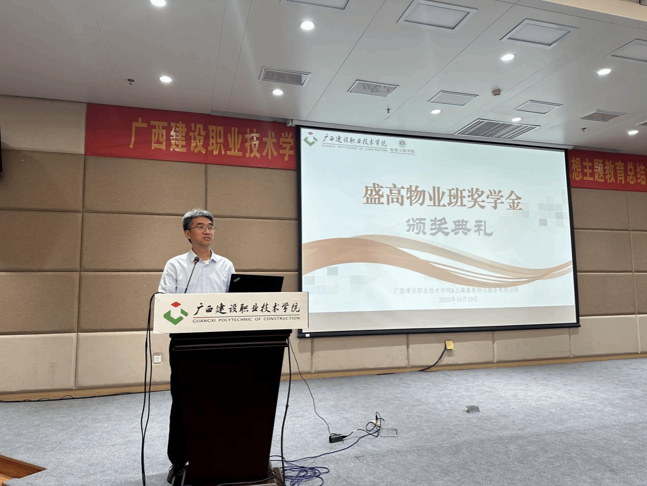 廣西建院10月11日訊(管理工程學院 張鈺棠)10月10日晚,盛高物業班獎學金頒獎儀式在學校四教一樓報告廳順利舉行。上海盛高物業服務有限公司人力中心總監季雪、人力中心高級經理林晨,上海盛高物業服務有限公司南寧中心城市總經理徐敏智、綜合部經理王芳,管理工程學院代端明副院長(主持行政工作)、羅輝副院長、現代物業管理專業教學團隊負責人黃娟老師,以及專業教師代表出席了頒獎典禮,現代物業管理專業2022級、2023級全體同學參加典禮。