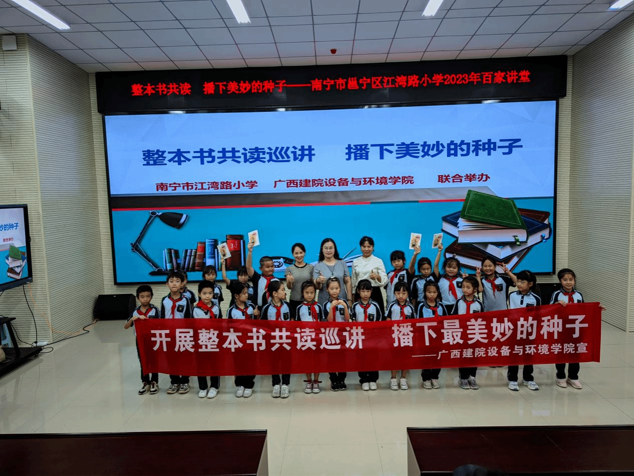 廣西建院10月28日訊(設(shè)備與環(huán)境學(xué)院 文/侯文淑 圖/韋思源 楊貴維)每一個(gè)人的生命都是一粒神奇的種子,童年是最美好的歲月,而閱讀能夠喚醒這種潛在的美好與神奇。10月27日下午,設(shè)備與環(huán)境學(xué)院黨總支書記侯文淑應(yīng)邀參加南寧市邕寧區(qū)江灣路小學(xué)開展的百家講堂活動(dòng),為200多名江灣路小學(xué)的學(xué)生導(dǎo)讀中華先鋒人物故事匯叢書——《袁隆平“東方稻神”》。