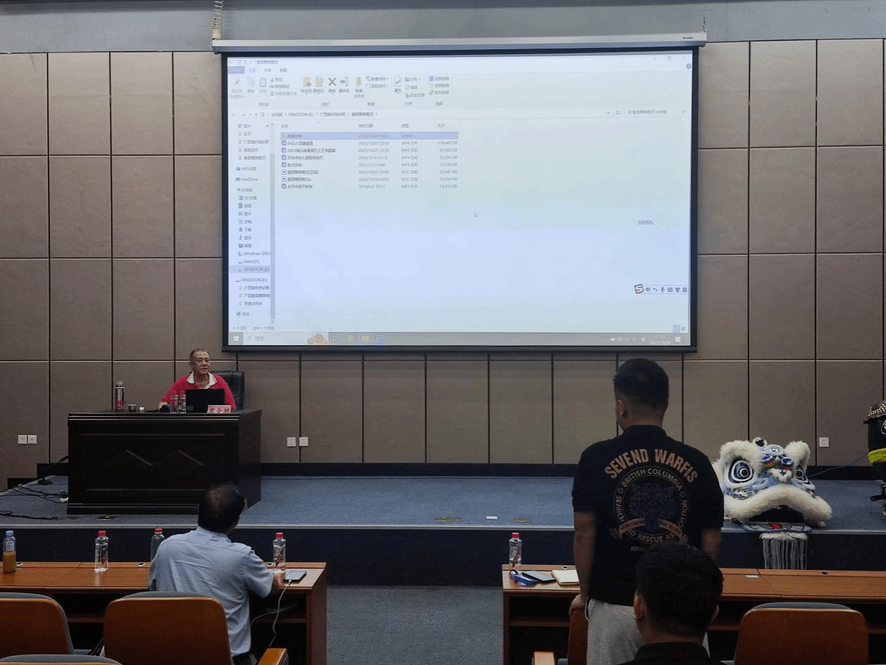 講座中,潘慧斌主席詳細講解了廣西龍獅運動發展的歷程和傳統文化進校園的意義,讓同學們了解此次講座的意義,同時也激發了同學們學習龍獅文化的熱情。廖金勝副主席用生動詼諧的語言,從廣西龍獅技藝的變革、舞獅道具、著裝及種類等方面對龍獅文化進行了詳細講解。