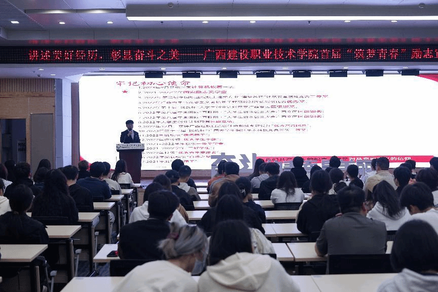 廣西建院12月9日訊(土木工程學院 文/馮光帆 圖/楊凱文)為講好奮斗故事,培養奮斗精神,助推優良校風學風形成,讓奮斗之美深入學業、匯入生活、融入文化、滲入人心,12月8日,由黨委學生工作部主辦、揚帆工作室承辦的首屆“筑夢青春”勵志宣講會(第二場)在四教二樓報告廳舉行。本場宣講會由揚帆工作室主持人馮光帆老師主持,來自7個二級學院的200余名家庭經濟困難生到場聆聽學習。