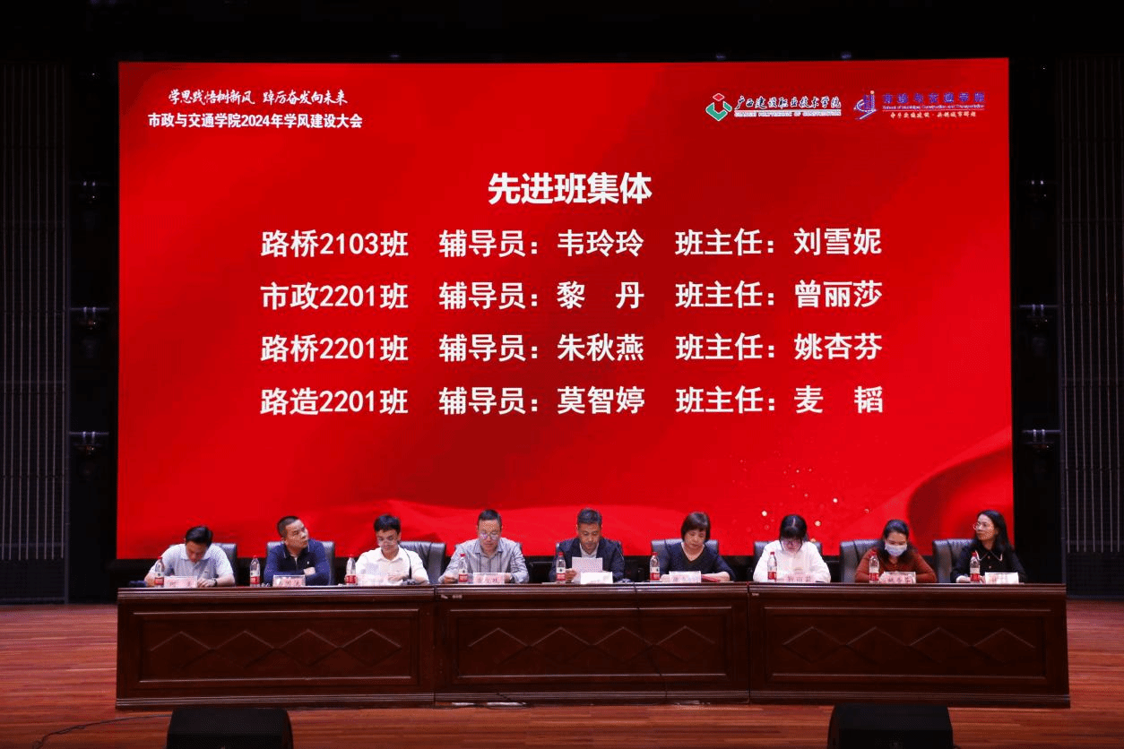 廣西建院3月28日訊(市政與交通學院 文/劉雪妮 圖/許大謙)為進一步加強市政與交通學院的學風建設,營造“比學趕幫超”的學習氛圍,助力大學生成長成才,市政與交通學院于3月26日下午在學校禮堂舉辦了“學思踐悟樹新風 踔厲奮發向未來”——2024年學風建設大會。市政與交通學院全體黨政領導、全體輔導員、專職教師,全體在校學生參加會議。會議由院長助理潘芳祿主持。