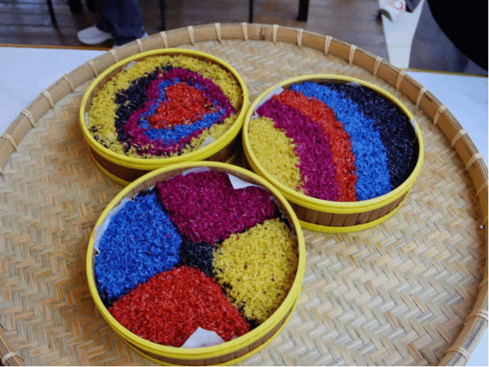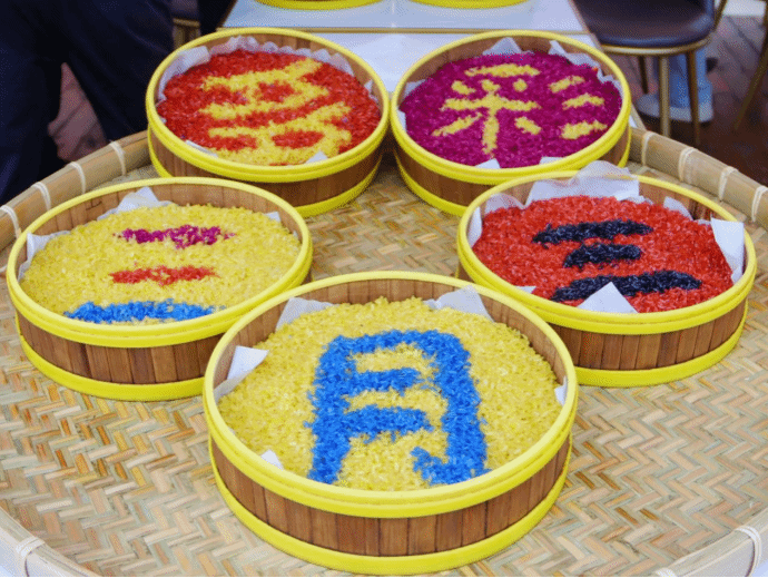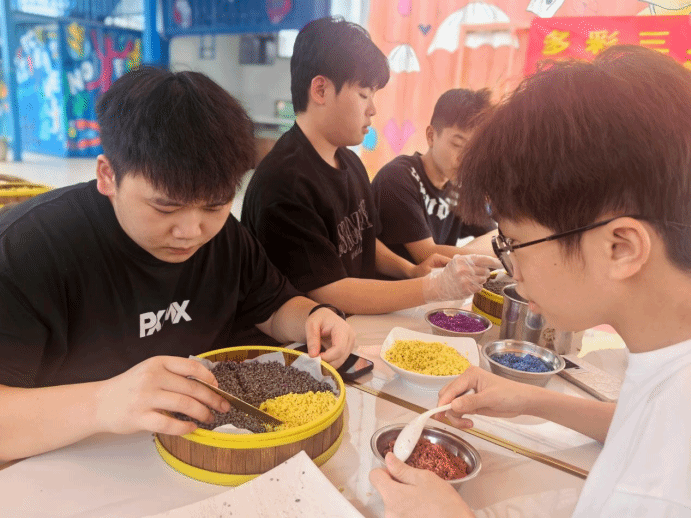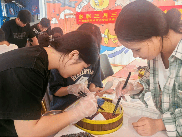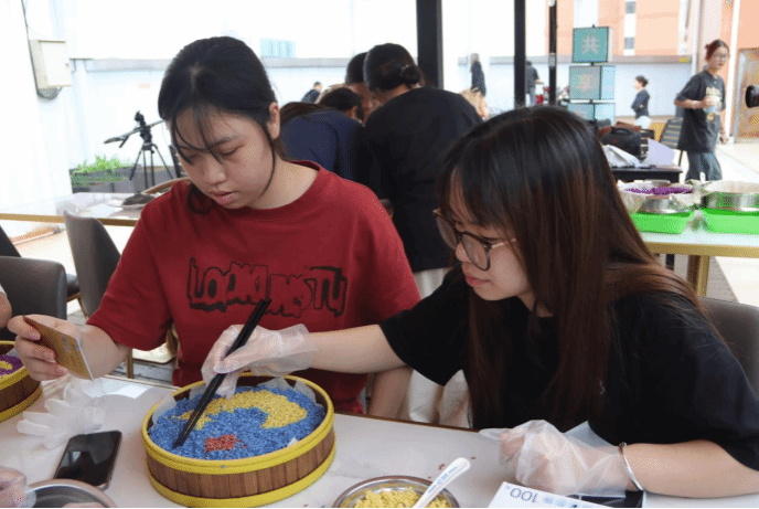 活動中,徐曉雪老師帶領同學們重溫了“廣西三月三”傳統節日的由來。在徐曉雪、李悉嫻兩位老師的指導下,同學們開始忙碌起來,完成剁原料、熬煮植物染料、泡制糯米等一道道工序,為次日糯米飯蒸制做好了準備。經歷了10小時浸泡,糯米色澤鮮艷,晶瑩透亮。同學們摩拳擦掌,躍躍欲試,隨即開始了五色糯米飯拼盤創作活動。同學們用靈巧的雙手和五彩斑斕的糯米飯呈現了不同的節日創意。大家紛紛展示自己的作品,現場歡笑聲不絕于耳,節日氛圍濃厚。