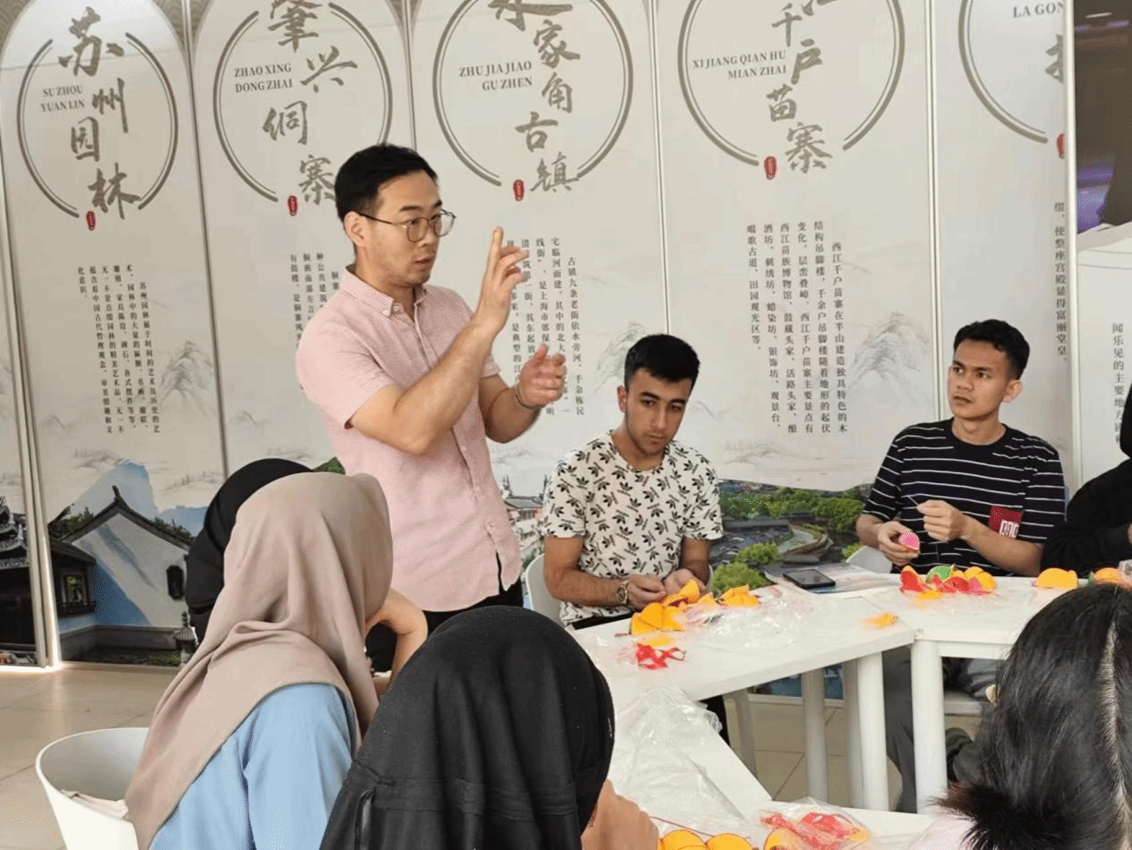 活動開始,梁金來老師帶領留學生參觀了學生社區非遺工作坊,并對部分非遺項目作了簡要介紹,重點介紹了具有廣西風情的非物質文化遺產——靖西繡球來歷、文化內涵、傳統寓意、制作工藝和文化價值等老師的帶領下大家制作繡球,沉浸式感受中國傳統文化的魅力