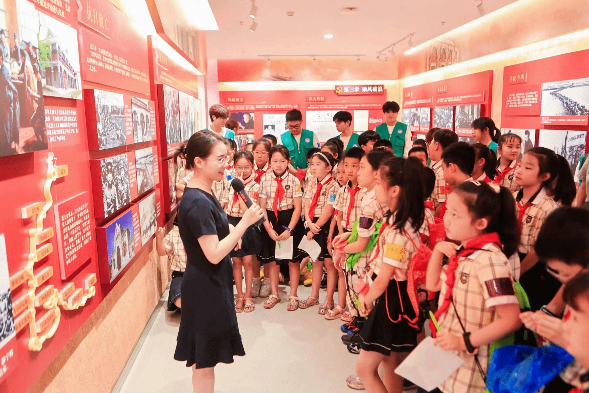 參觀紅色展館,感受光輝歷程。小朋友們走進黨史館,與黃哲和甘麒燕兩位老師一起互動交流。通過生動的語言和詳實的歷史資料,兩位老師向孩子們講述自中國共產黨建黨以來幾代人篳路藍縷艱苦奮斗的偉大征程,激發孩子們愛國愛黨的熱情。兩位老師還精心設計了紅色知識探秘環節。孩子們帶著問題,在各場館內自由尋找答案。互動式的學習方式不僅激發了孩子們的學習興趣,也讓他們更加主動地參與到研學活動中來。