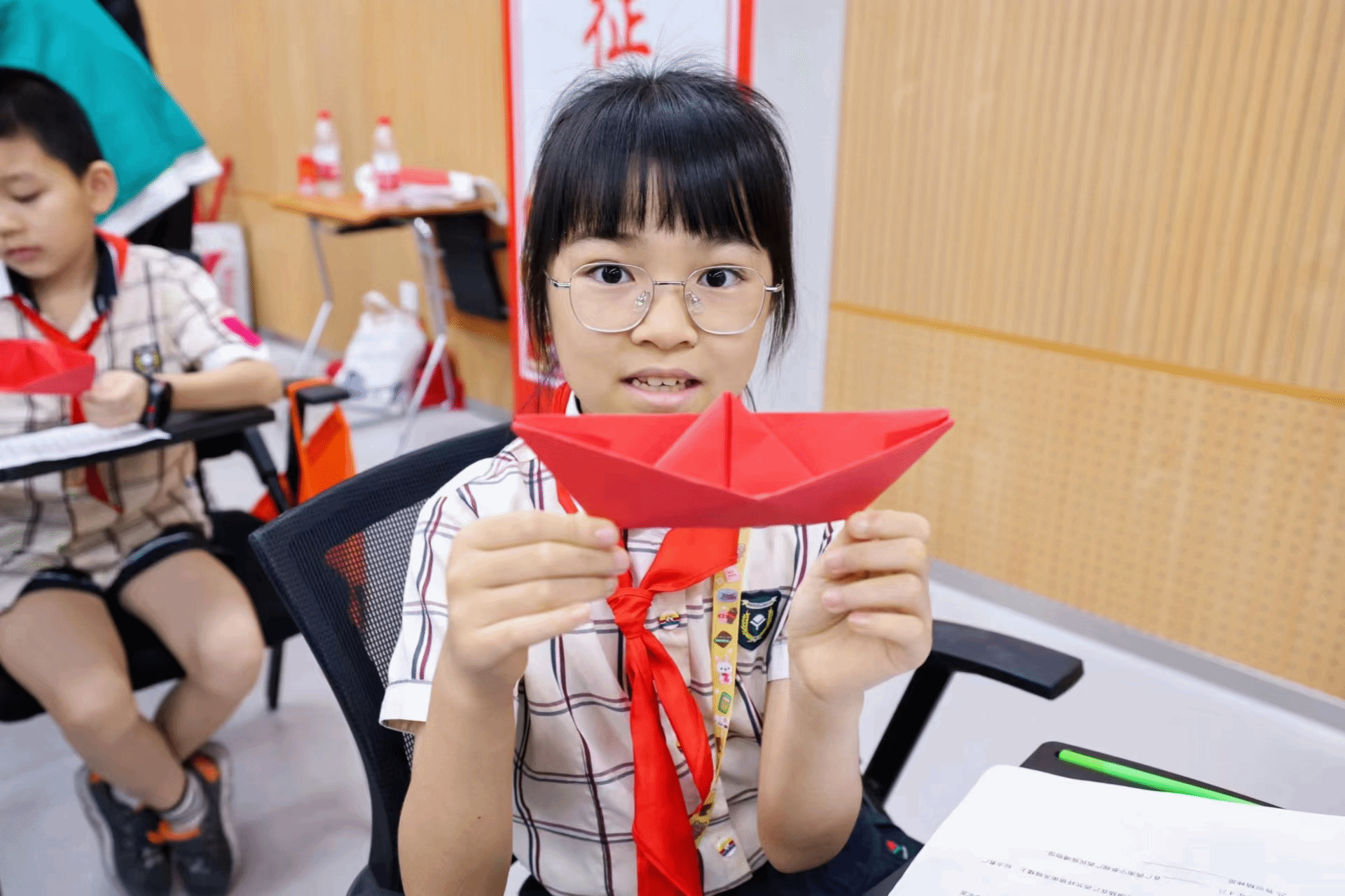 小朋友舉起自己折疊的紅船分享感悟