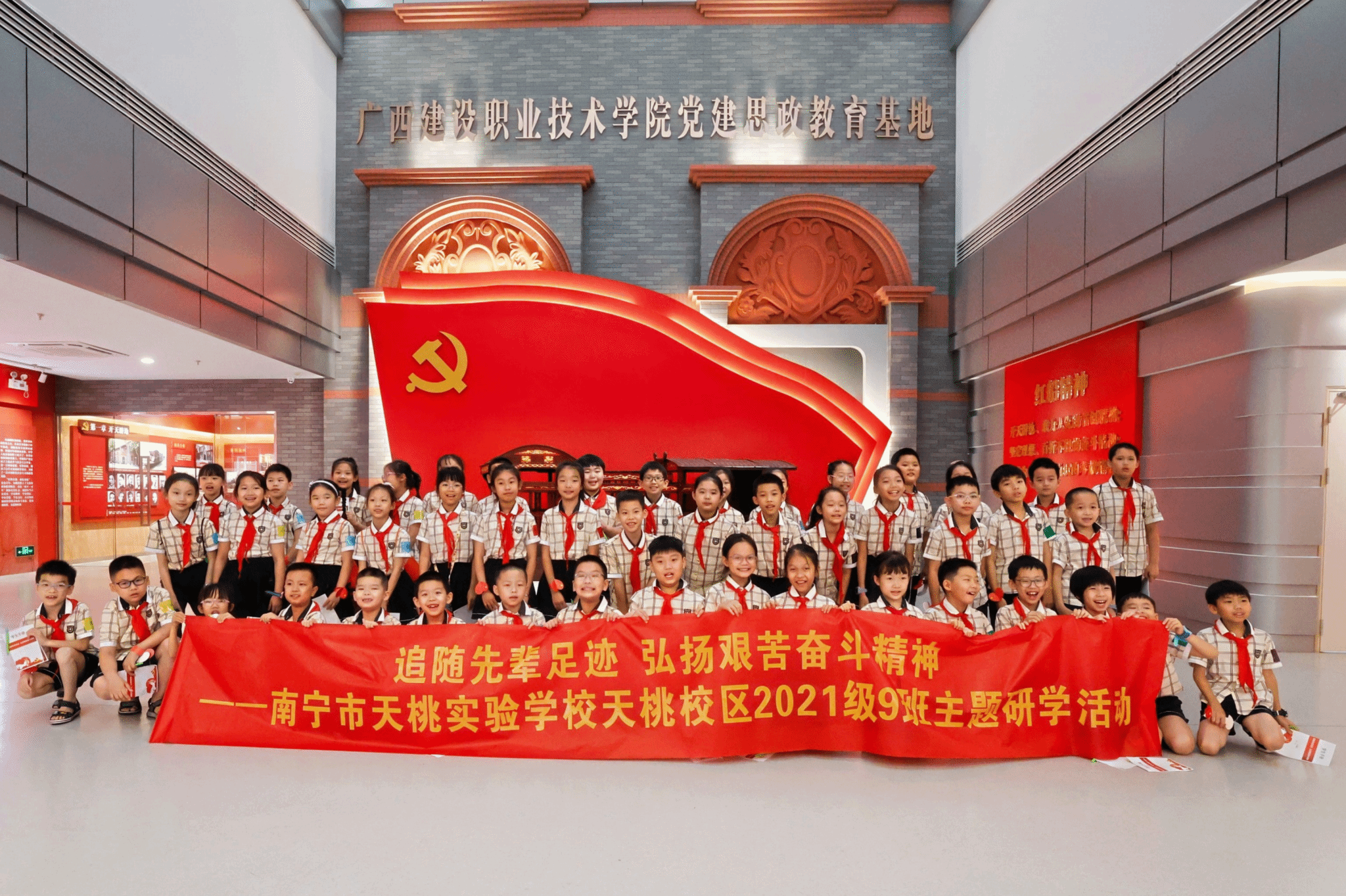 廣西建院6月17日訊(馬克思主義學院 甘麒燕 繼續教育學院王慧淼)6月15日,廣西建設職業技術學院黨建思政教育基地迎來了天桃實驗學校教育集團天桃校區2021級9班的49位小朋友。