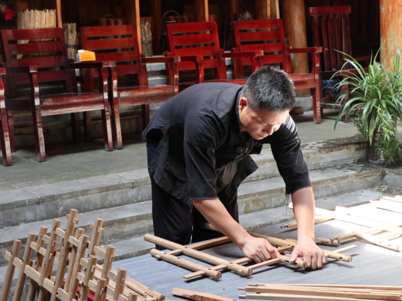 傳承團(tuán)成員還原搭建吊腳樓模型