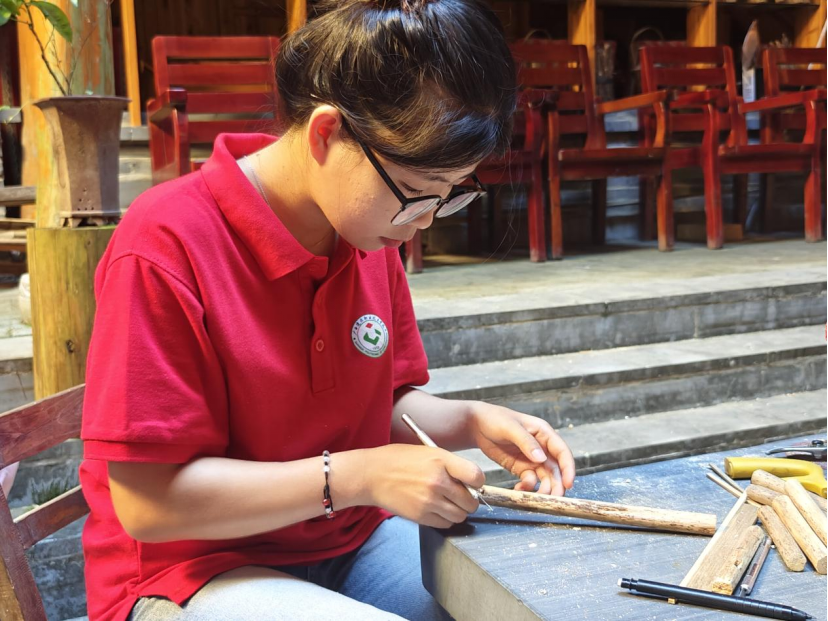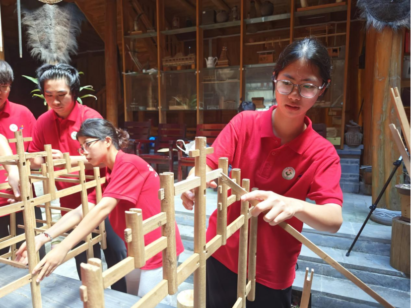 “跟著大師學(xué)非遺”——親手搭建,解鎖木構(gòu)建筑的奧秘。在非遺傳習(xí)基地,楊云東師傅先對(duì)吊腳樓營造技藝進(jìn)行了詳細(xì)講解,接著,對(duì)吊腳樓模型進(jìn)行了拆解。實(shí)踐團(tuán)按照模型原樣根據(jù)楊云東師傅的講解展開還原搭建。隨后,傳承團(tuán)在楊云東師傅的指導(dǎo)下從原材料開始準(zhǔn)備,通過丈量尺寸、鑿榫打眼、穿梁接拱、立柱連枋等工序按照現(xiàn)有鼓樓模型尺寸一比一復(fù)刻制作新模型,解鎖一塊塊木頭如何變成一座精美的木構(gòu)建筑模型,親身體驗(yàn)侗族木構(gòu)建筑營造技藝的精妙之處,深刻理解了這門技藝背后的文化內(nèi)涵和傳承意義,加深了對(duì)侗族文化的了解與認(rèn)同。