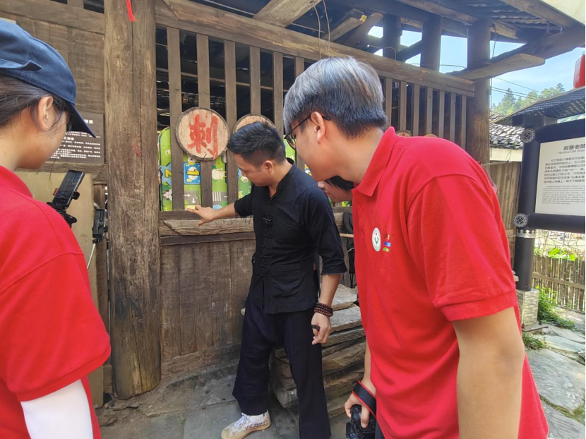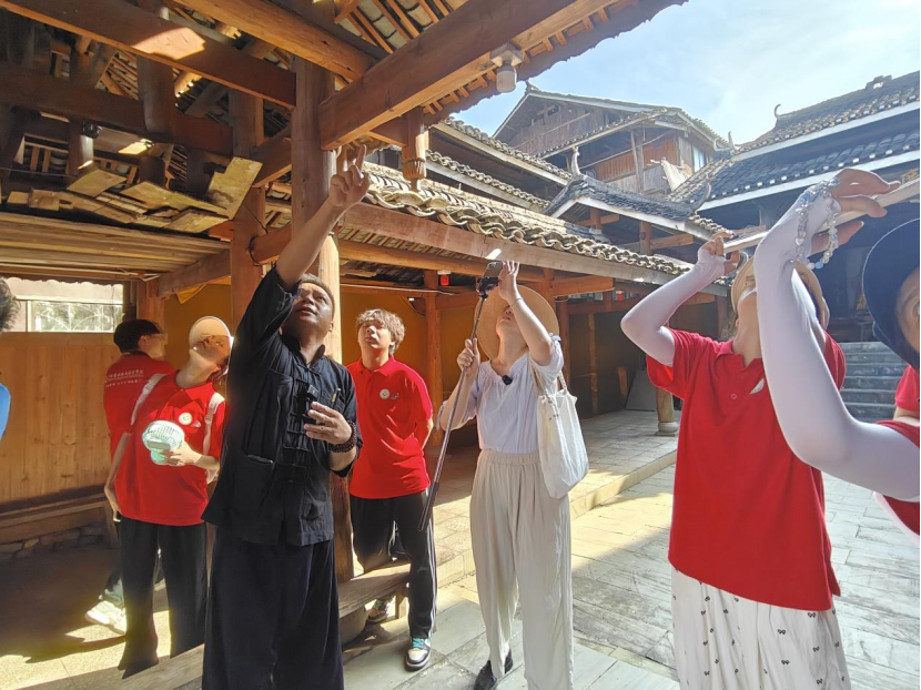 “跟著大師訪非遺”——深入侗寨,探尋木構(gòu)建筑的故事。在楊云東師傅的帶領(lǐng)下,傳承團(tuán)沉浸式探訪了程陽八寨多個(gè)代表性建筑,如侗寨飛山廟、巖寨老鼓樓、吊腳樓群、程陽永濟(jì)橋以及侗族木構(gòu)博物館等,近距離感受侗寨古老建筑的獨(dú)特魅力。在楊云東師傅的詳細(xì)解讀下,傳承團(tuán)成員紛紛用鏡頭從各個(gè)角度記錄下工匠們獨(dú)特的技藝,激發(fā)了大家對(duì)侗族木構(gòu)建筑文化的濃厚興趣。探訪結(jié)束后,為了加深印象,傳承團(tuán)還針對(duì)侗寨代表性建筑組織了“你畫我猜”“你比我猜”“你講我猜”等游戲活動(dòng),以趣味性的方式鞏固了相關(guān)知識(shí)。