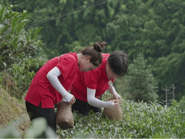 深入茶園,感悟農耕文化。實踐團成員腰挎茶簍,深入茶園,幫助茶農采摘茶葉。在茶農的指導下,成員們學習到了六堡茶的采摘標準為一芽兩葉,采摘時不可緊捏、緊壓,以免芽葉破碎,既要保證摘下的芽葉完整,又不能傷害到茶樹。彎腰、伸手、采摘,一次次重復著相同的動作,隊員們體驗了農耕生活的辛勤與耐心,品味了收獲的樂趣。