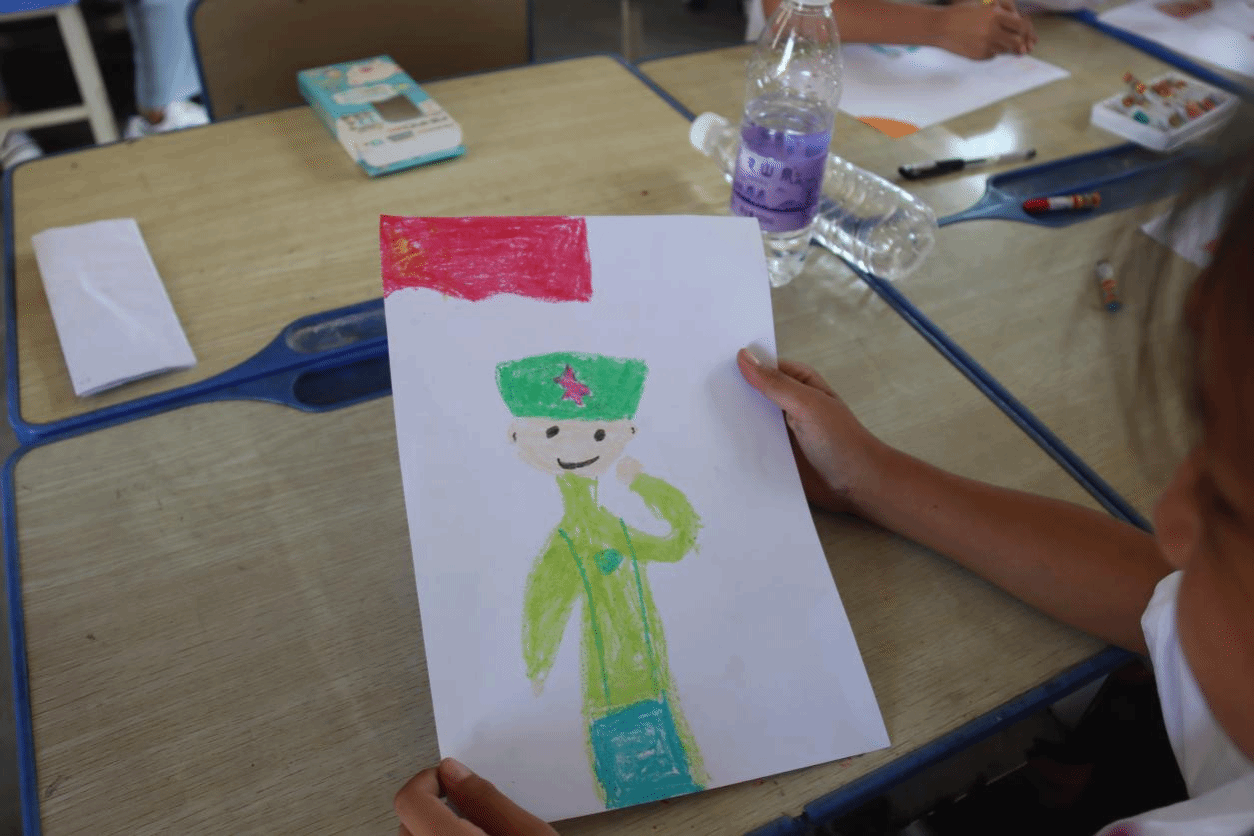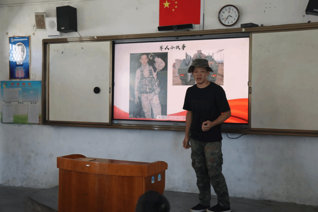 “一聲到,一生到!在部隊訓練的時光是我難忘的人生經(jīng)歷,希望通過我的故事激發(fā)同學們投身軍營保家衛(wèi)國的愛國情懷。”實踐團成員吳芋全是退役士兵,他化身“紅船精神講述人”,將自己參軍入伍的親身經(jīng)歷與教學點的同學們分享,用“小故事”引出“大道理”,為小朋友們種下一顆胸懷祖國勇于擔當?shù)姆N子。