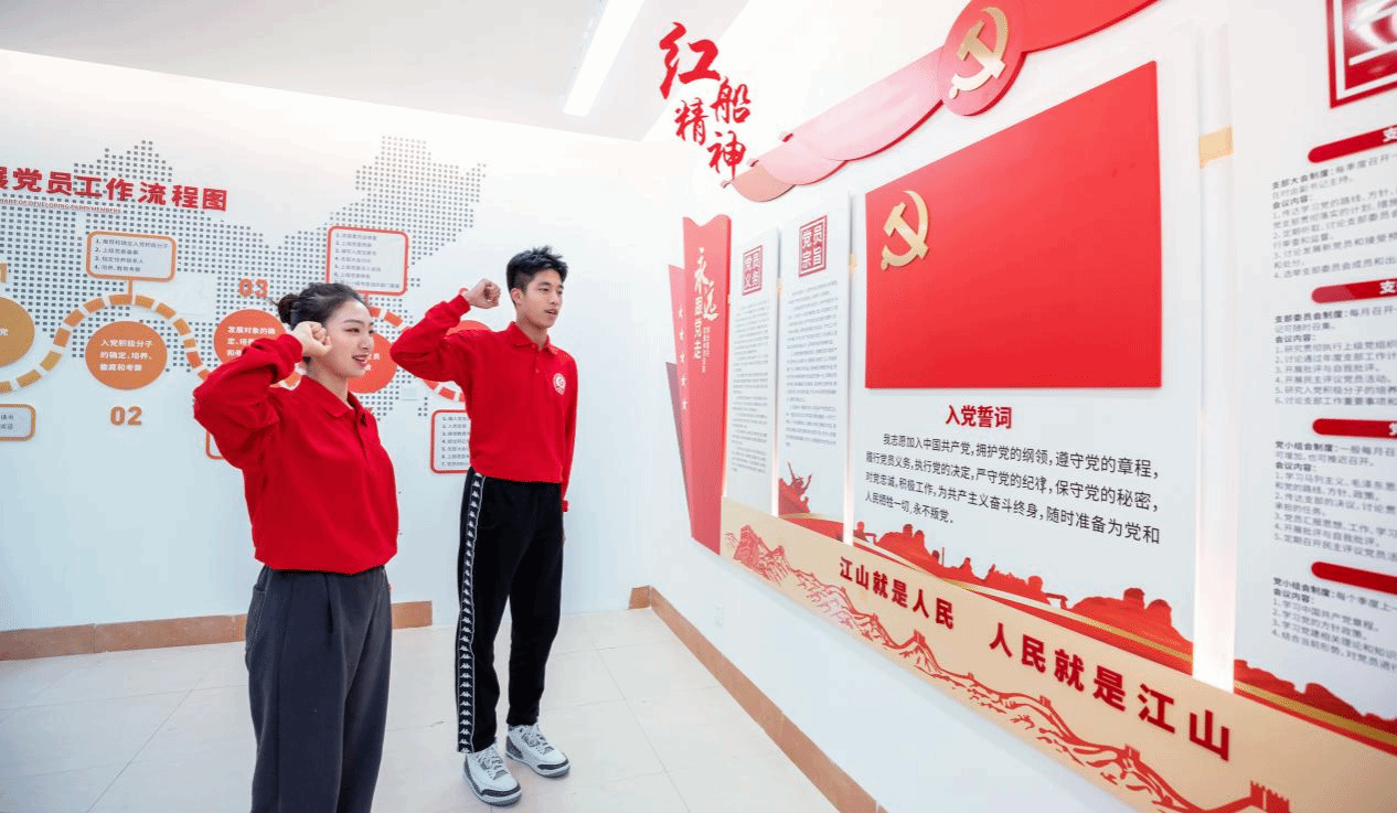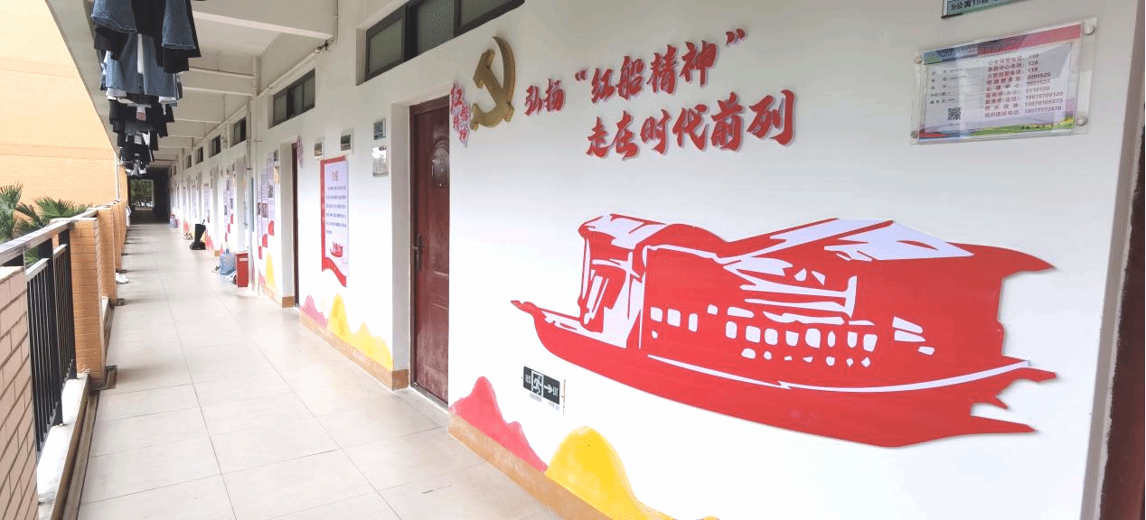 管理工程學院“紅船精神”黨建工作室按照“七有”進行創建,聚焦“紅船精神”,在學校五公寓門廳建成30平米的黨建工作室微型學習體驗中心,精心挑選1500余冊紅色書籍供師生取閱。同時,結合工作室文化元素對周邊學生公寓現有資源進行升級和改造,將“紅船精神”工作室文化建設延伸至公寓長廊,師生共同設計制作,打造了200余平米的“開放式、步入式、沉浸式”的 “紅船精神”文化墻,實現了紅色文化的有形覆蓋。