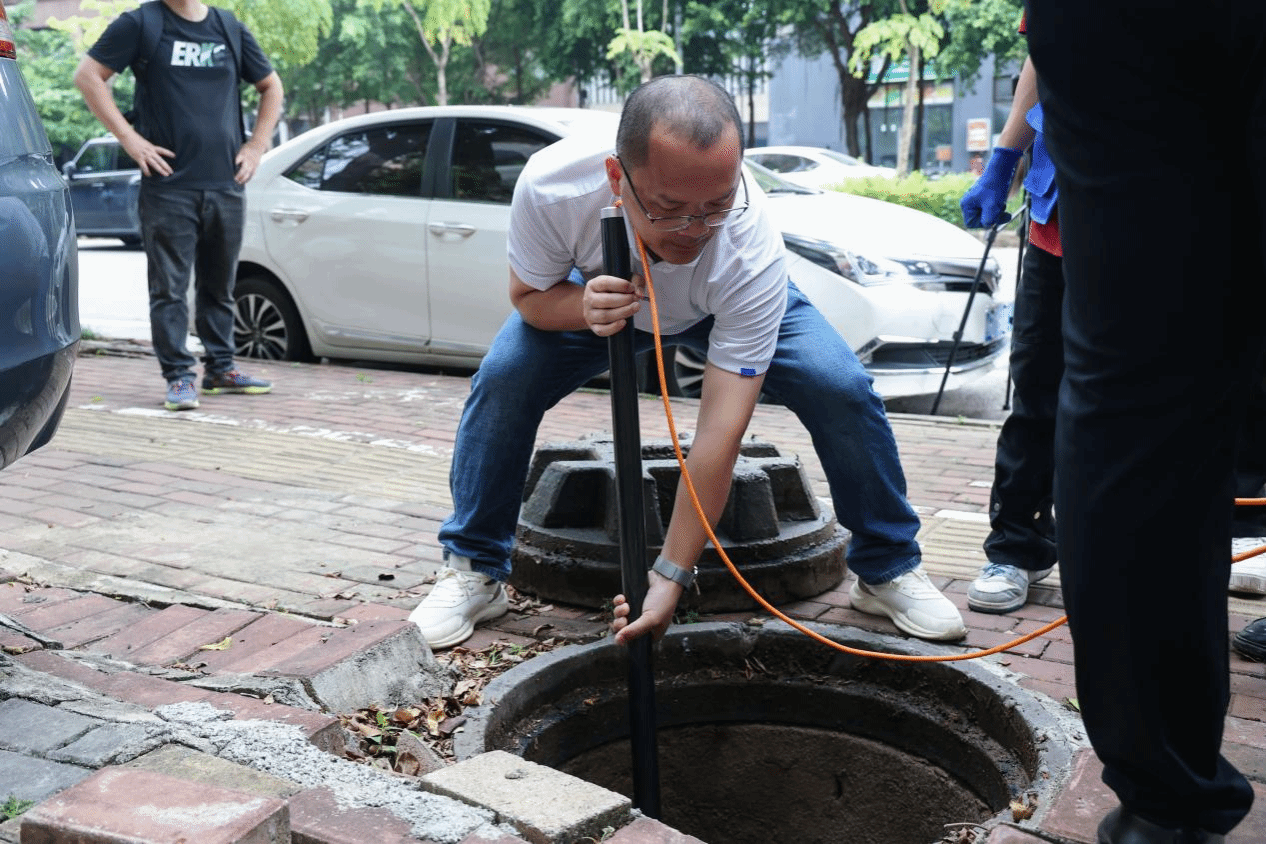 志愿服務(wù)的內(nèi)容分為下水管道檢測組和社區(qū)清潔組兩大板塊,同步在社區(qū)內(nèi)推進(jìn)志愿服務(wù)工作。下水管道安全檢測組的志愿者們一到社區(qū),迅速行動,在社區(qū)工作人員的指導(dǎo)下手持手電筒、檢測鏡、測量尺等專業(yè)工具,使用管道內(nèi)窺潛望鏡專業(yè)檢測儀器對小區(qū)的下水管道進(jìn)行了細(xì)致的排查。指導(dǎo)老師梁志武憑借豐富的專業(yè)經(jīng)驗,全過程指導(dǎo)志愿者進(jìn)行檢測操作及研究,一堂“行走”專業(yè)實踐課程就此展開。志愿者們一邊檢測,一邊詳細(xì)記錄發(fā)現(xiàn)的問題,包括堵塞、滲漏等潛在安全隱患的位置、類型和嚴(yán)重程度,并拍攝了照片以備后續(xù)處理。通過他們的認(rèn)真細(xì)致地工作,小區(qū)的下水管道得到了有效地排查和維護(hù),為居民的安全居住提供了有力保障。