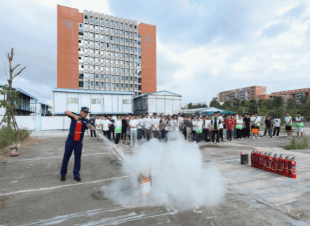 學(xué)生們現(xiàn)場進(jìn)行消防滅火器的實(shí)際操作