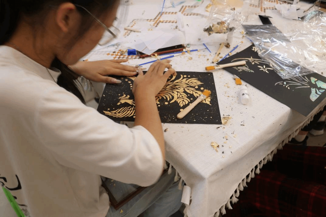 活動(dòng)中,學(xué)生充分發(fā)揮想象力和創(chuàng)造力,通過(guò)打線稿、涂膠水、貼金箔、掃金箔等步驟,將傳統(tǒng)工藝與現(xiàn)代審美相結(jié)合,以箔為墨,繪制出一幅幅精美絕倫的燒箔畫(huà)作品。燒箔畫(huà)制作不僅展現(xiàn)了燒箔畫(huà)獨(dú)特的藝術(shù)魅力,還激發(fā)了學(xué)生們對(duì)中華優(yōu)秀傳統(tǒng)文化的興趣和熱愛(ài)。