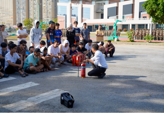 11月8日下午,全體留學(xué)生在各自宿舍聽(tīng)到消防警報(bào)聲后,按照消防逃生要求,用濕毛巾捂緊口鼻,快速有序地從所在宿舍樓層的各個(gè)安全出口到對(duì)應(yīng)的疏散集合地點(diǎn)。隨后,學(xué)校物業(yè)、保衛(wèi)處工作人員向同學(xué)們講解如何正確使用滅火器,并組織指導(dǎo)同學(xué)們輪流進(jìn)行滅火器的實(shí)操體驗(yàn),感受真實(shí)場(chǎng)景下使用滅火器的技巧和安全注意事項(xiàng)。