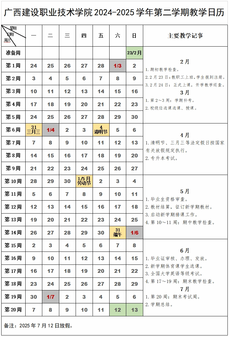 廣西建設職業技術學院2024-2025學年第二學期教學日歷