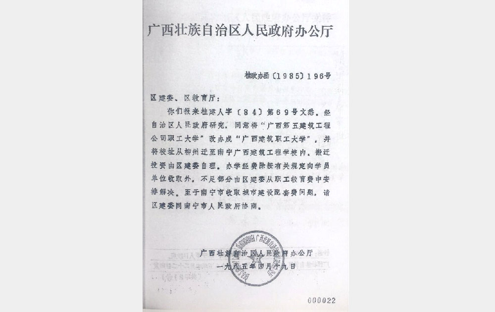1985年元月,經自治區人民政府批準,在廣西建筑工程學校同時增設“廣西城鄉建設環保學校”,并明文規定學校掛兩塊牌子,一套領導班子;同年11月,根據區人民政府辦公廳桂政辦函﹝85﹞196號文精神,批準廣西建筑工程五公司職工大學改辦成廣西建筑職工大學,將校址由柳州遷至廣西建筑工程學校內。至此,廣西建筑工程學校、廣西城鄉建設環保學校和廣西建筑職工大學三校一體,掛三塊牌子,一套領導班子。教職工270余人,其中教師121人,校園建筑總面積32000平方米,藏書10萬冊。
