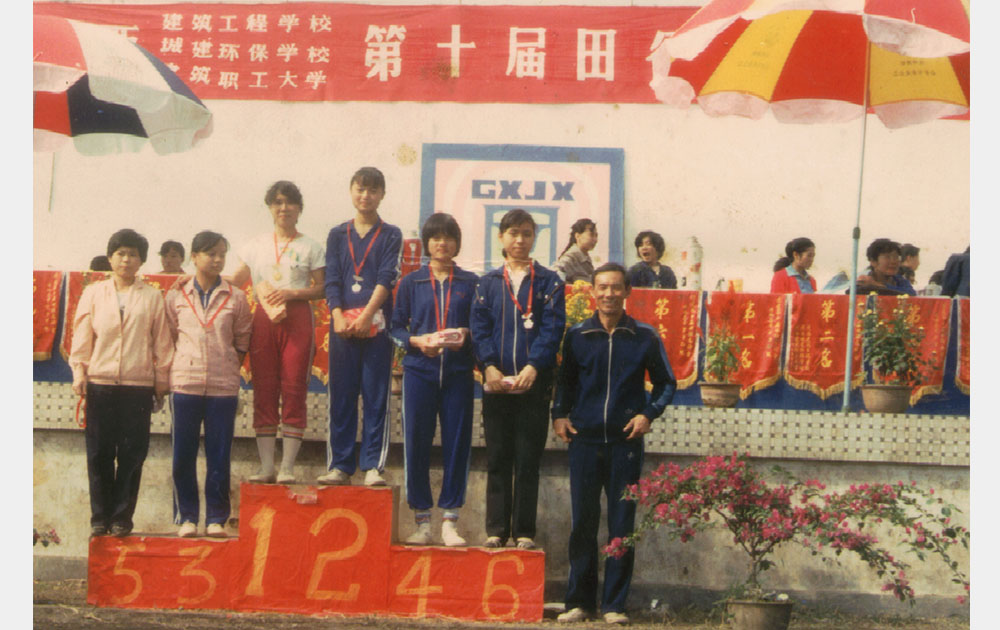 80年代鮑若玫老師(左二)與79級學生在校門前合影
