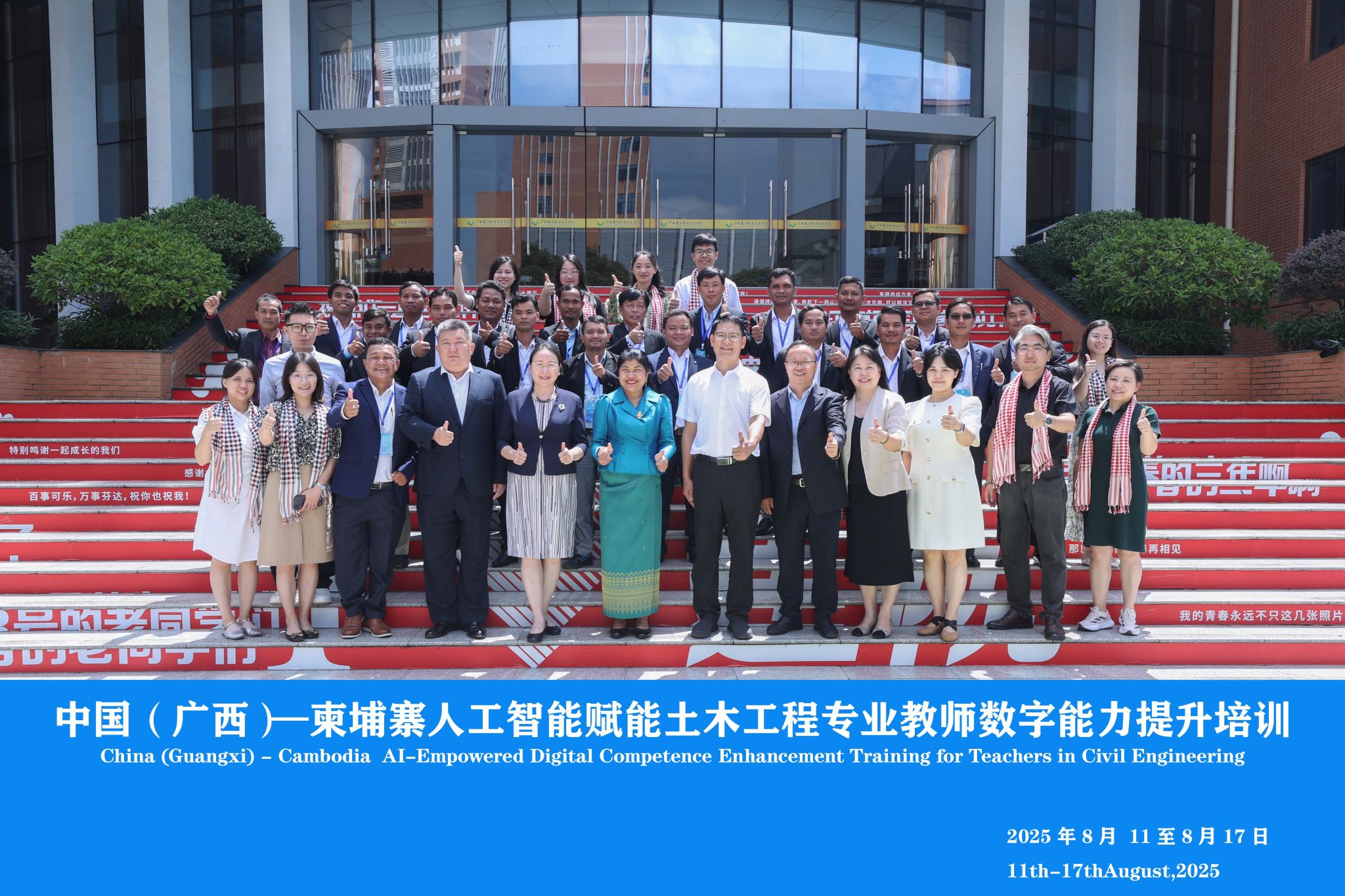 8月11日至17日,中國(廣西)—柬埔寨人工智能賦能土木工程專業教師數字能力提升培訓班在我校順利舉行。17日上午,培訓班舉行結業典禮,自治區教育廳對外合作與交流處一級調研員呂青,柬埔寨勞工部職教司副司長嚴·碧瑪莉卡,柬埔寨中國學校校長李翼,我校黨委副書記、校長梁業勝等中柬雙方代表出席。典禮由副校長付春松主持。 培訓班合影梁業勝校長在致辭中向圓滿完成培訓任務的柬方教師表示祝賀。柬埔寨學員代表波·白林老師在發言中分享了學習心得,...
