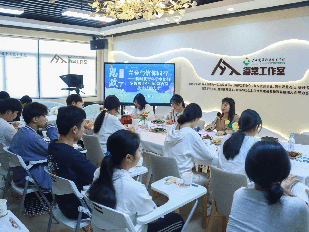 廣西建院10月18日訊(管理工程學院 文/莫文娟 黃春 圖/黃春)為引導學生樹立遠大理想,做奮勇有擔當的有志青年,10月17日下午,管理工程學院在海棠工作室開展第20期“思政下午茶”活動。本期下午茶論題為《青春與信仰同行,新時代青年如何爭做勇于擔當的復合型技術技能人才》,由學院黨務干事、專職組織員賴小華老師主講,輔導員韋彩霞、班主任王慧淼到場與25位同學面對面討論。賴小華老師表示,職業教育肩負著培養多樣化的人才傳承技術技能,...