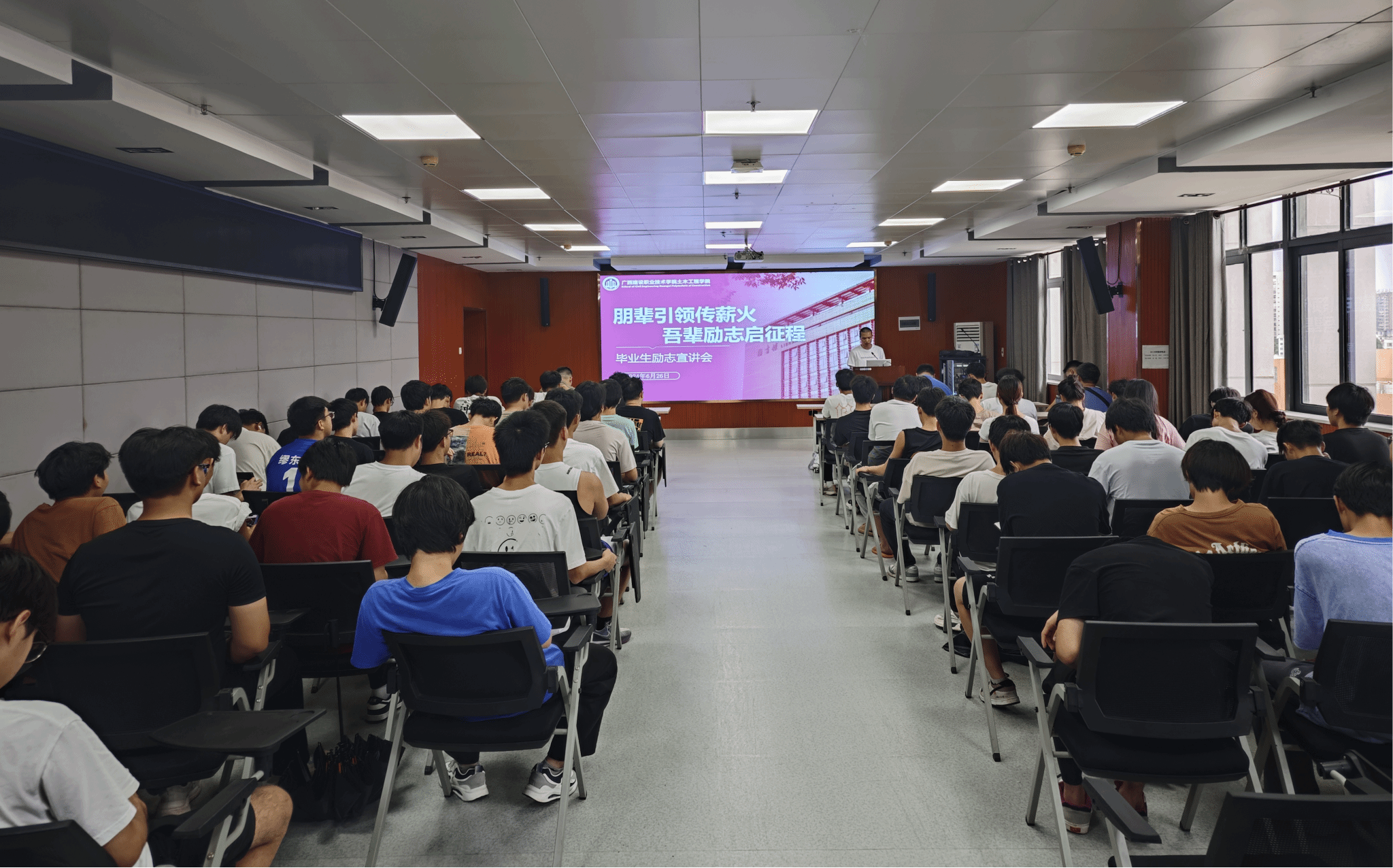 廣西建院6月27日訊(土木工程學(xué)院訊 文/石明成 圖/朱運(yùn)基 陳乃錦)為進(jìn)一步加強(qiáng)畢業(yè)生思想政治教育,強(qiáng)化畢業(yè)生理想信念,厚植愛黨愛國愛校情懷,近日,土木工程學(xué)院開展“愛國奮斗,愛校榮校”畢業(yè)季系列主題教育活動(dòng)。學(xué)院舉辦“朋輩引領(lǐng)傳薪火,吾輩勵(lì)志啟征程”畢業(yè)生勵(lì)志宣講會(huì)。活動(dòng)由學(xué)院優(yōu)秀畢業(yè)生韋劭煬、王俊逸、李同旺等同學(xué)圍繞在校學(xué)習(xí)、日常生活、實(shí)踐鍛煉、實(shí)習(xí)經(jīng)歷等方面進(jìn)行分享,鼓勵(lì)同學(xué)們明確奮斗目標(biāo),珍惜大學(xué)時(shí)光,...