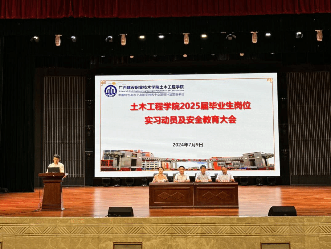 廣西建院7月10日訊(土木工程學院訊 文/石明成 圖/韋景朝 何可人)為進一步加強畢業崗位實習過程管理和安全教育,明確崗位實習要求,7月9日,土木工程學院在學校禮堂分批次召開2025屆畢業生崗位實習動員及安全教育大會。土木工程學院院長李朝陽,黨總支書記孔祥剛,副院長葛春雷、羅獻燕等學院領導出席,實習老師代表、2025屆畢業生輔導員及畢業生參加大會。大會由吳國堃老師主持。會上,羅獻燕副院長從畢業實習指導老師安排,畢業實習期間注意事項,...