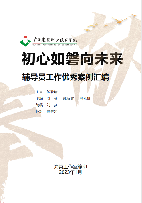 廣西建院5月4日訊(管理工程學(xué)院 郭海棠)為總結(jié)與展示學(xué)生工作的理論與實(shí)踐成果,近日,我校編印完成第一本校本化輔導(dǎo)員工作優(yōu)秀案例匯編《初心如磐向未來(lái)——廣西建設(shè)職業(yè)技術(shù)學(xué)院輔導(dǎo)員工作優(yōu)秀案例匯編》,為我校...