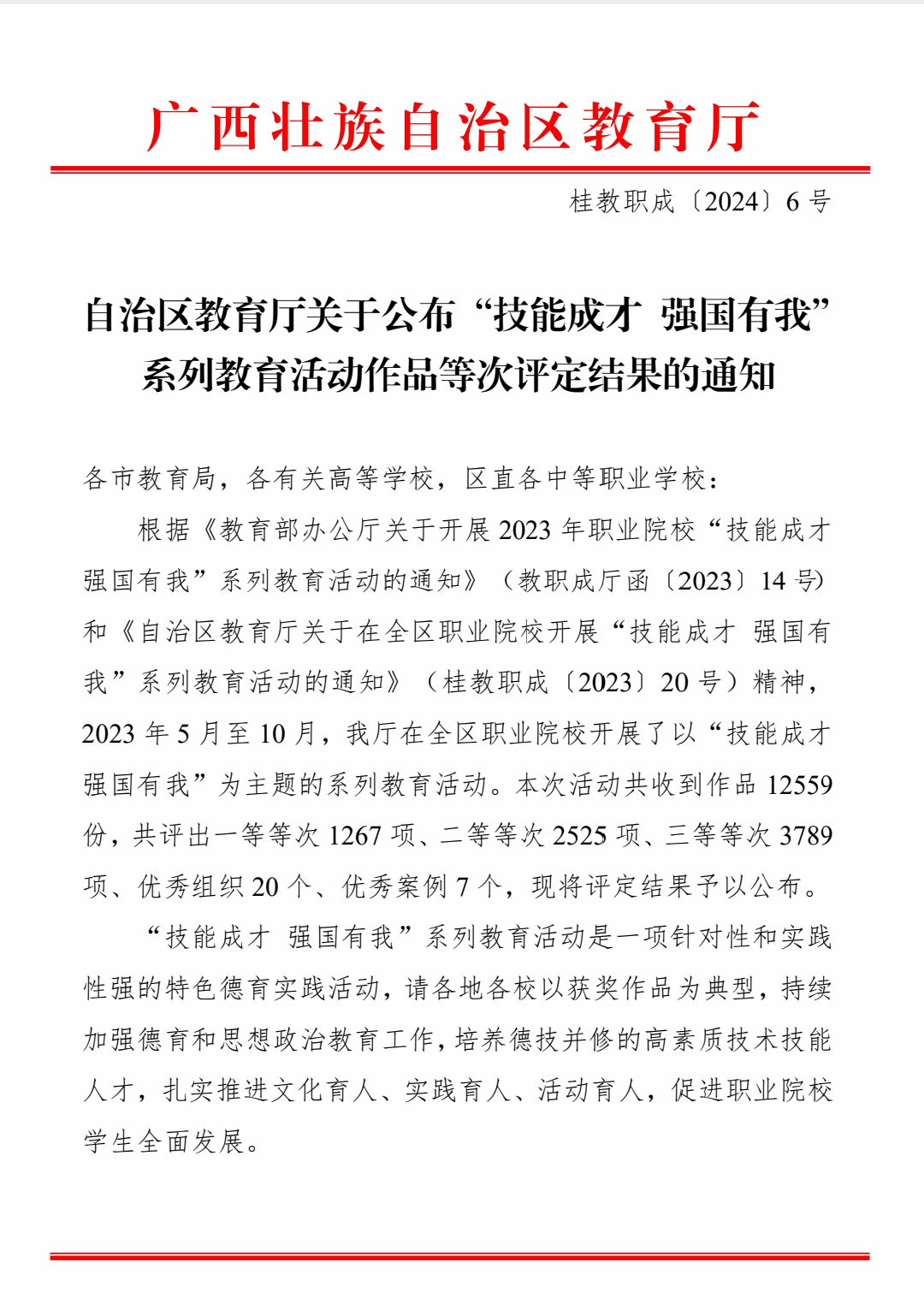 廣西建院2月23日訊(黨委學生工作部 田申)近日,根據《自治區教育廳關于公布“技能成才 強國有我”系列教育活動作品等次評定結果的通知》(桂教職成[2024]6號),我校獲獎12項,其中一等獎1項、二等獎6項、三等獎4項,典型案例榮獲三等獎。