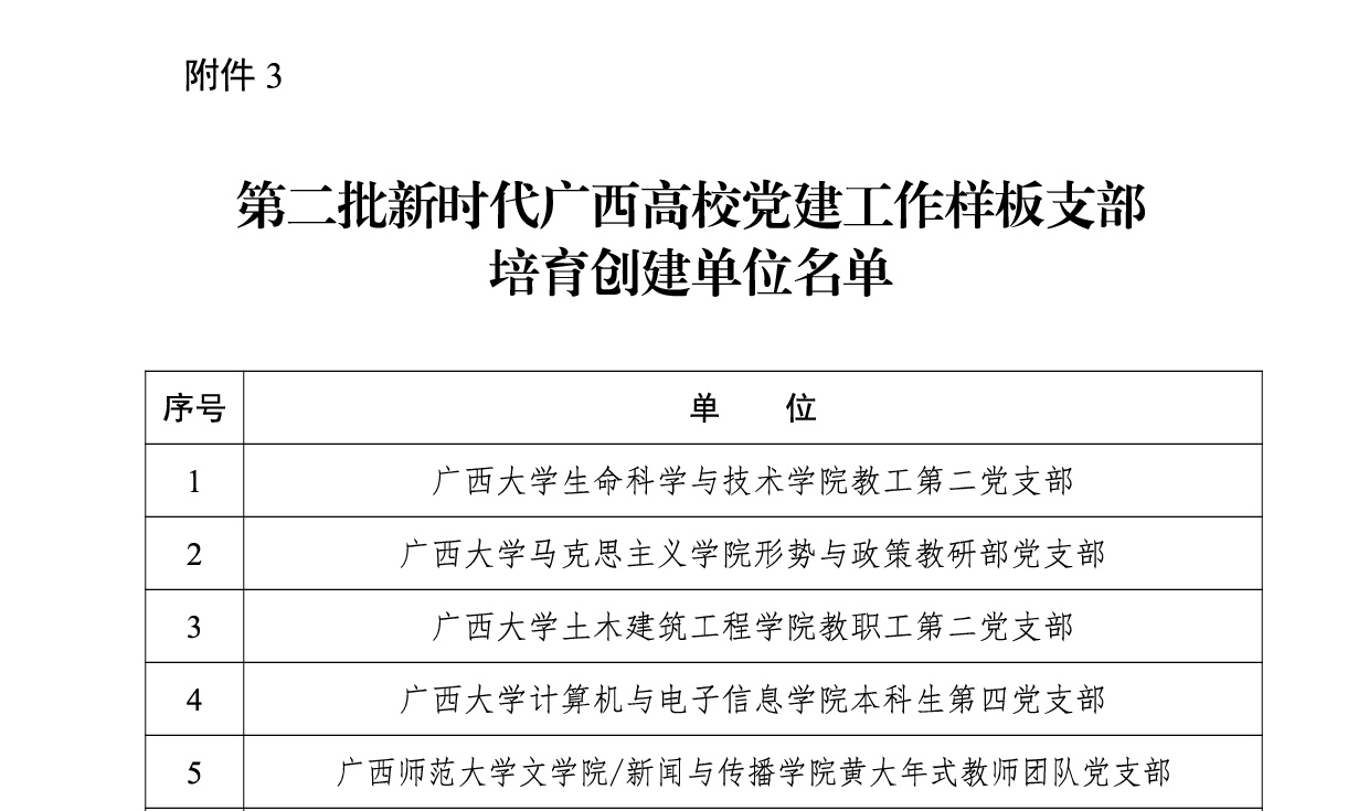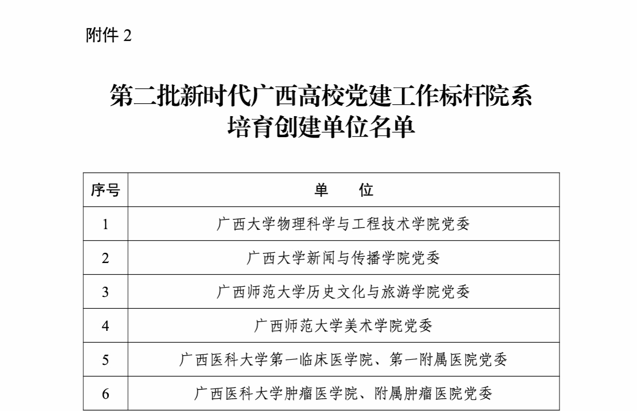廣西建院9月16日訊(黨委組織部 潘金德)近日,中共廣西壯族自治區委員會教育工作委員會發布《自治區黨委教育工委關于公布第二批新時代廣西高校黨建示范創建和質量創優工作培育創建單位名單的通知》(桂教工委組〔2023〕51號),確認第二批5個黨建工作示范高校、50個黨建工作標桿院系、132個黨建工作樣板支部培育創建單位。其中,我校黨委被確認為廣西高校黨建工作示范高校培育創建單位,設備與環境學院黨總支被確認為廣西高校黨建工作標桿院系培育創建單位,市政與交通學院教工黨支部、建筑與規劃學院學生黨支部被確認為廣西高校黨建工作樣板支部培育創建單位。